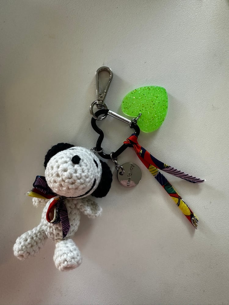 Snoop est crocheté à la main en fil de coton écru et noir , un mousqueton 🖤une résine cœur vert fait main , un ruban assorti au petit noeud de snoop et une médaille chloé fallay . Un gros mousqueton argent permet de l’accrocher sur toutes les anses de sac.