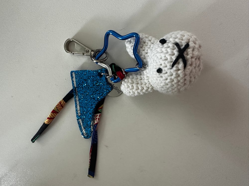 Grigri composĂ© dâ un lapin crochetĂ© main en coton Ă©cru , dâune rĂ©sine basket faite main, un ruban assorti et dâune mĂ©daille « chloe fallay », un ruban assorti en polyester, un mousqueton Ă©toile et un grand mousqueton pour lâaccrocheter Ă votre sac prĂ©fĂ©rĂ© . Finition argent