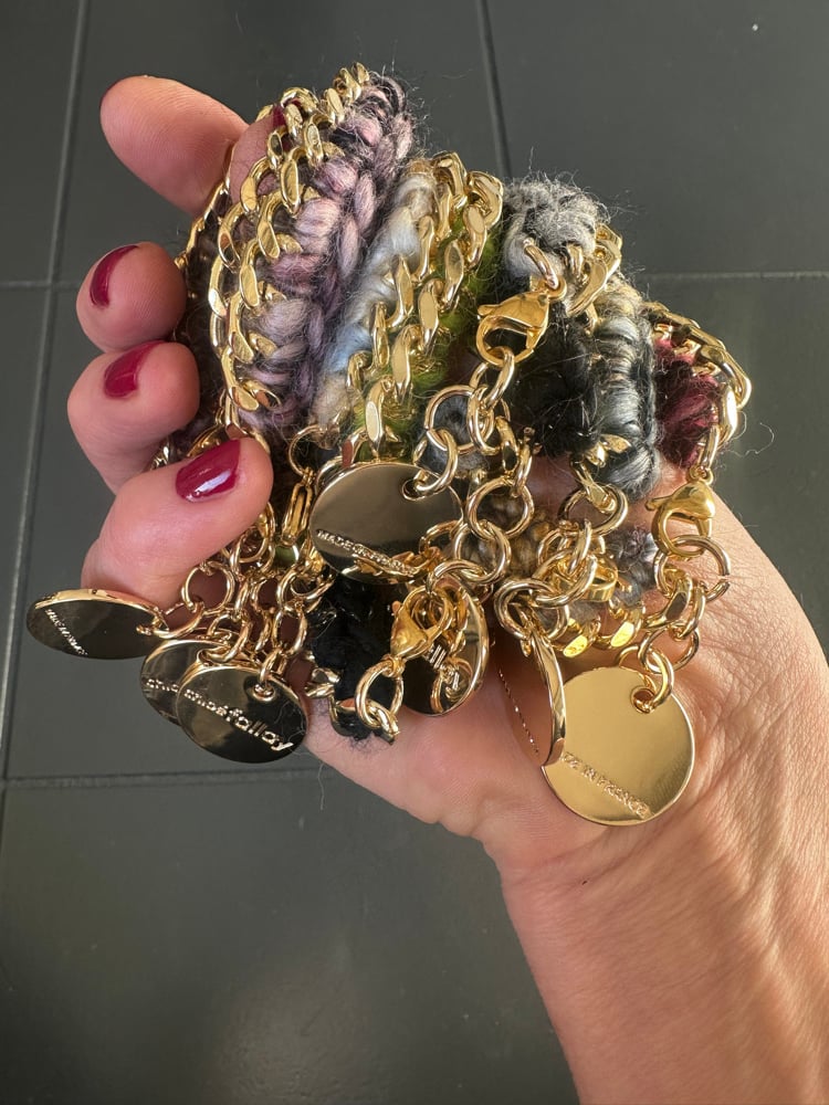Bracelet en acier inoxydable de haute qualité + médaille Chloé Fallay , finition crochetée avec un fil mélange tweed laine majoritaire.