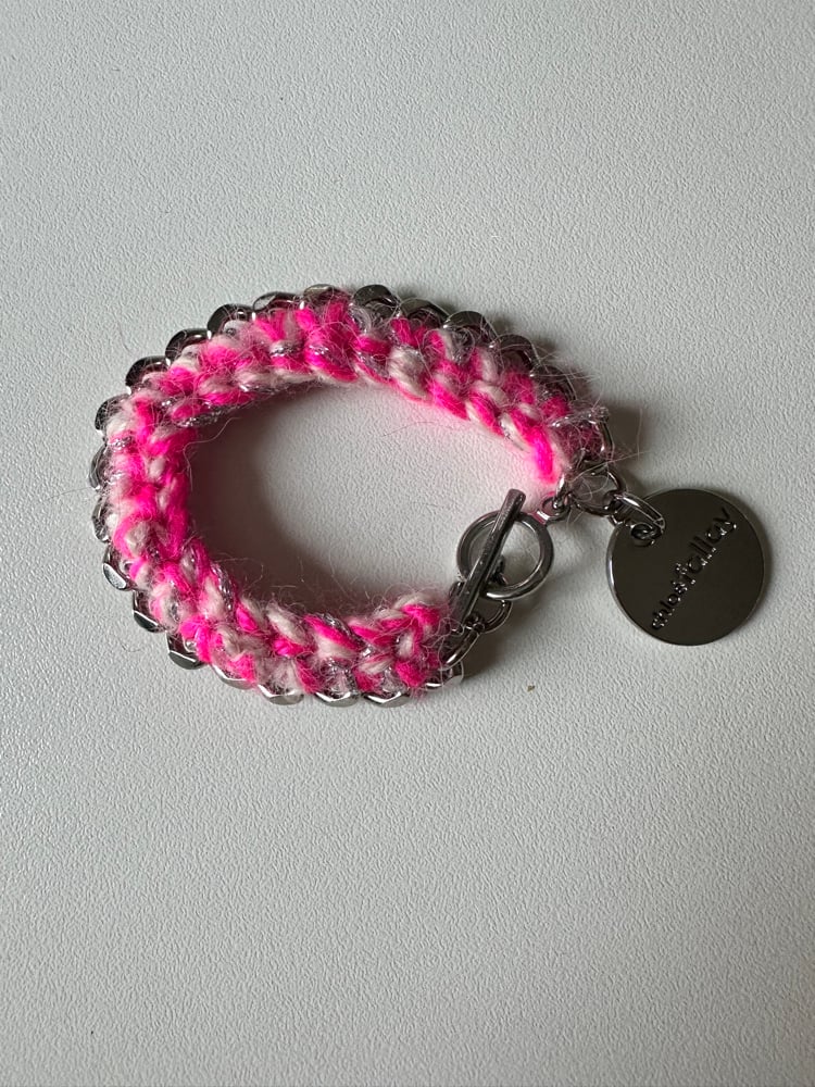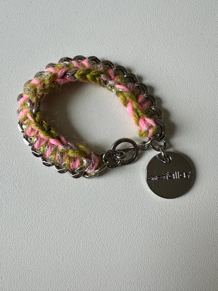 Bracelet en acier inoxydable de haute qualité + médaille Chloé Fallay , finition crochetée avec 2 fils laineux colorés + fil de lurex argent .