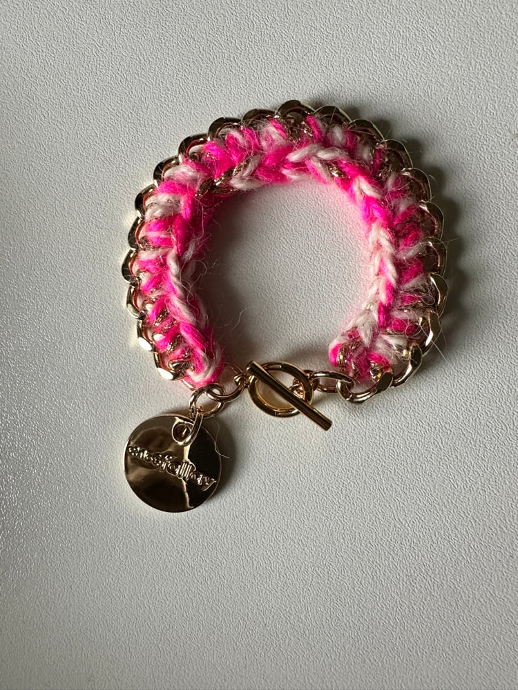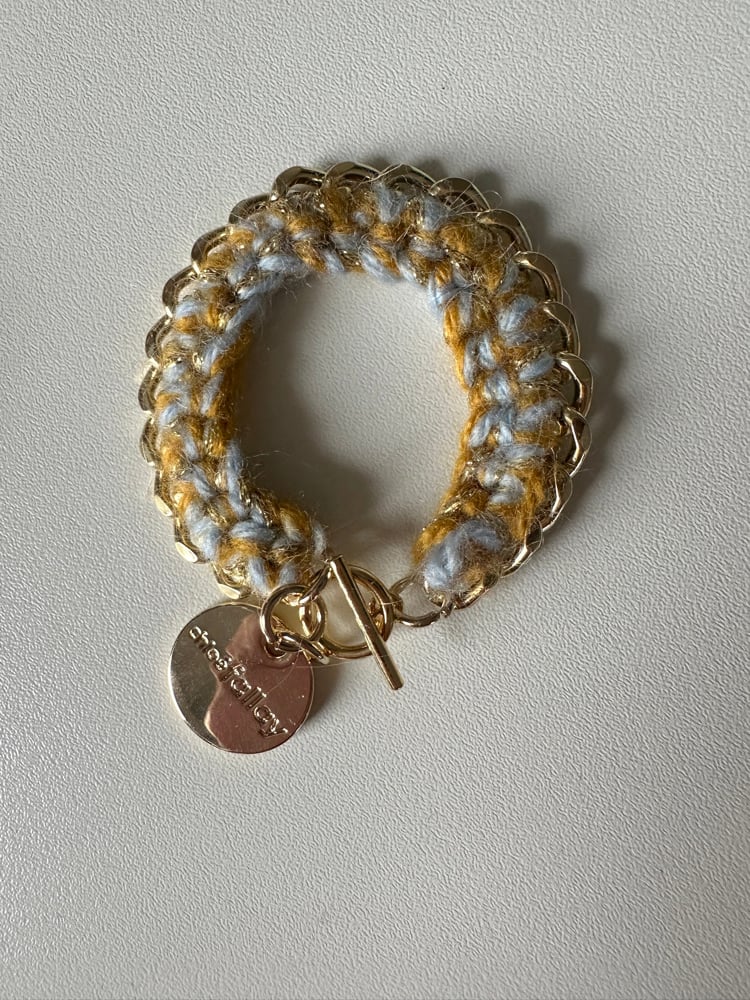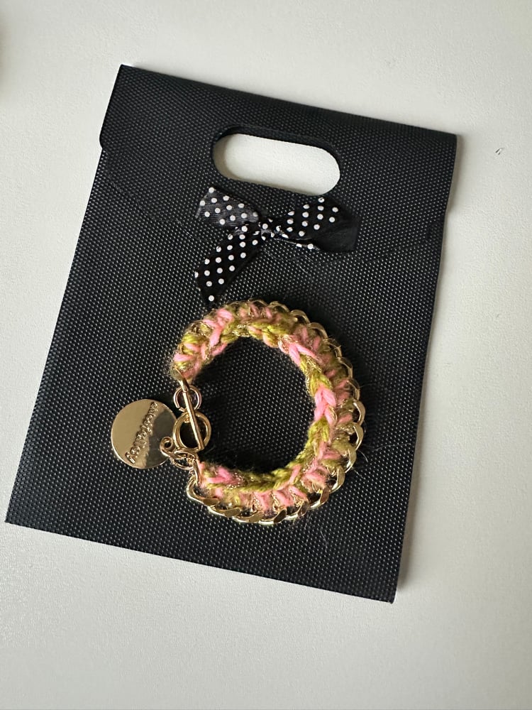 Bracelet en acier inoxydable de haute qualité + médaille Chloé Fallay , finition crochetée avec 2 fils laineux colorés + fil de lurex doré .