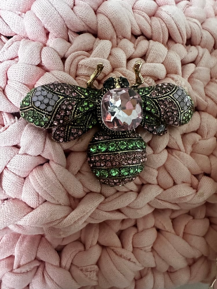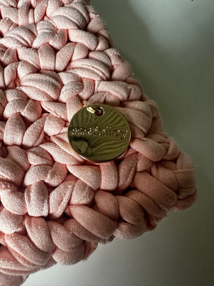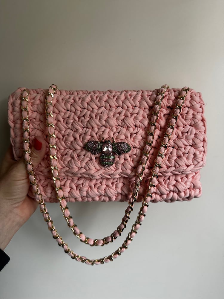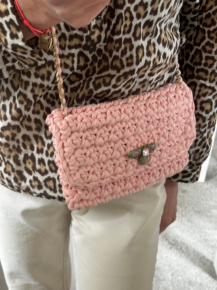 Chacha classic (format enveloppe) rose pastel . Crocheté à la main avec un fil de jersey recyclé 90% coton. Chaîne coulissante dorée, fermoir aimanté doré et broché papillon rose et vert.