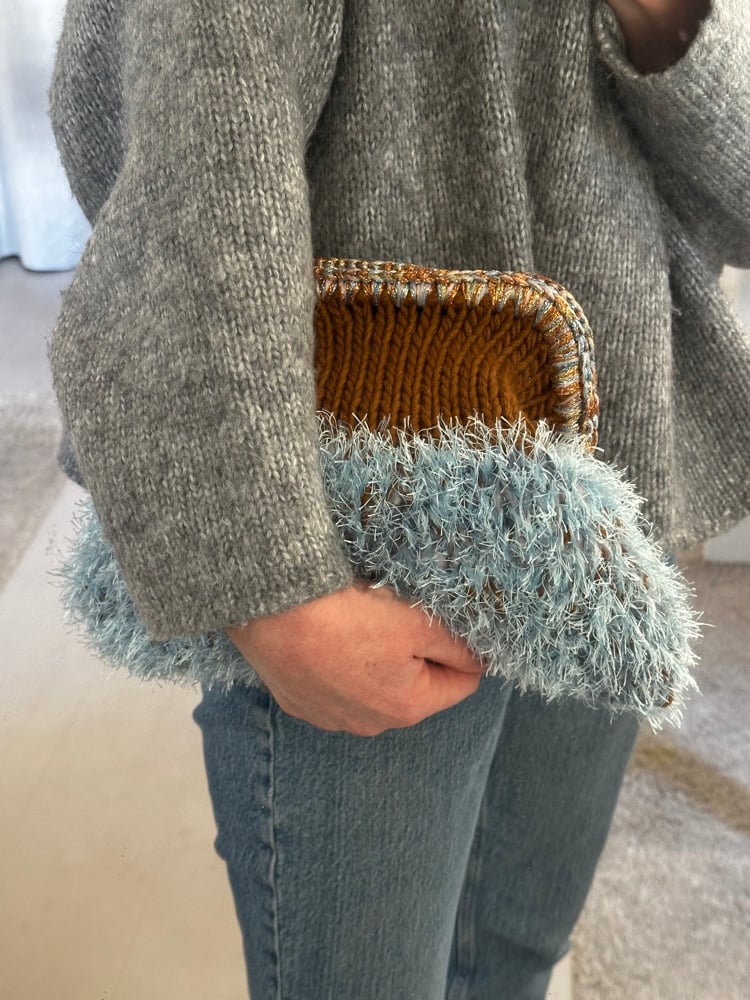 Pochette crazy clutch entièrement tricotée à la main.