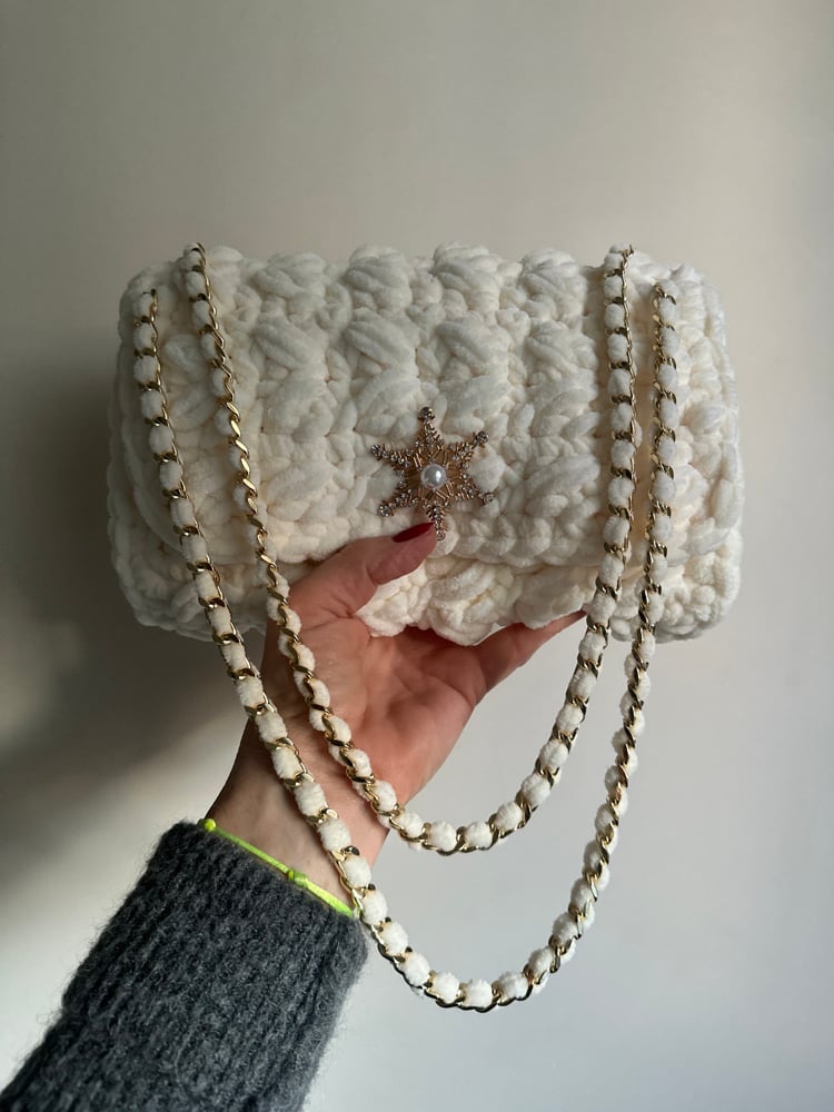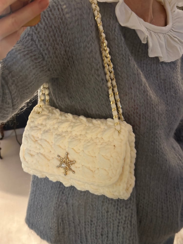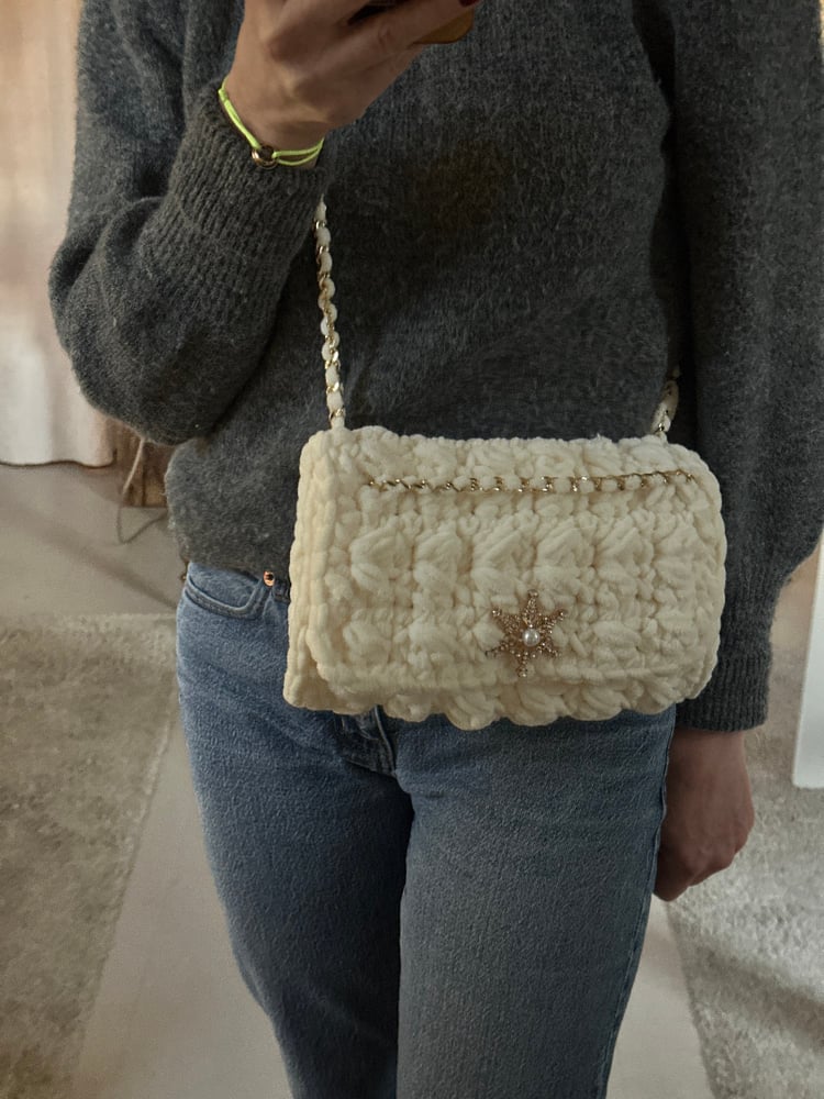 Sac réalisé à la main en velours crocheté écru.
