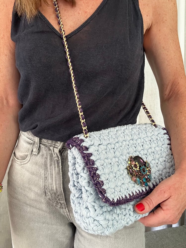 Crocheté à la main avec des fils upcyclés 90% coton.