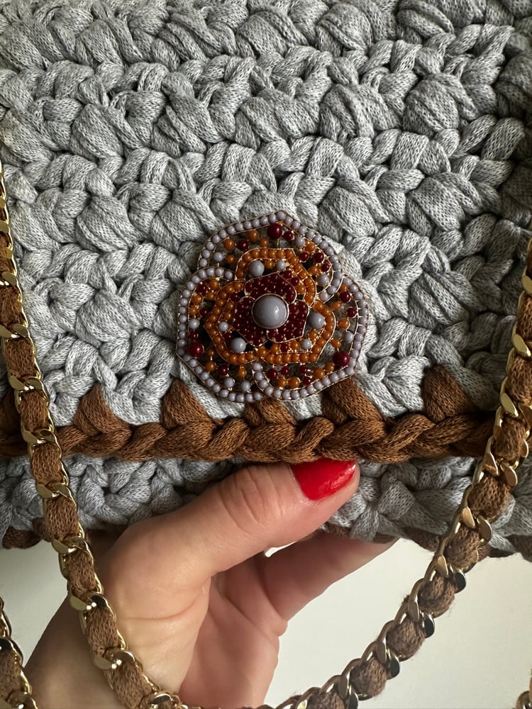 Broche en perles grises et camel finition dorée assortie.