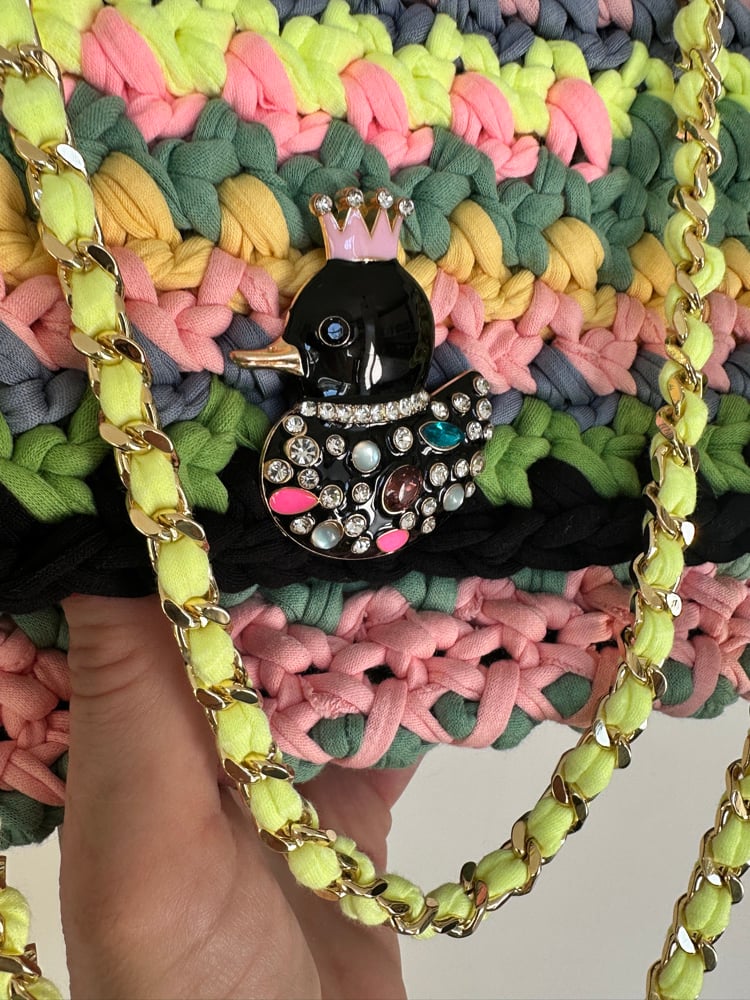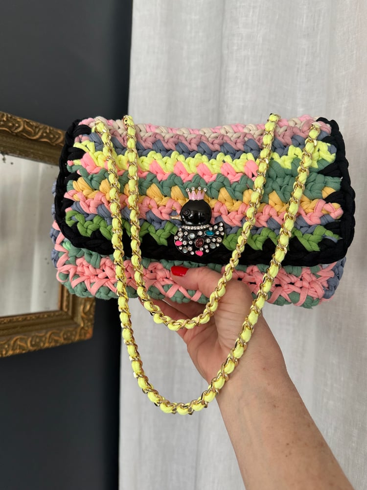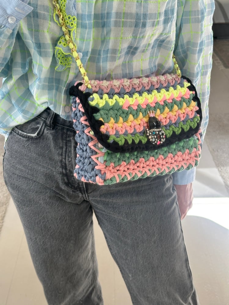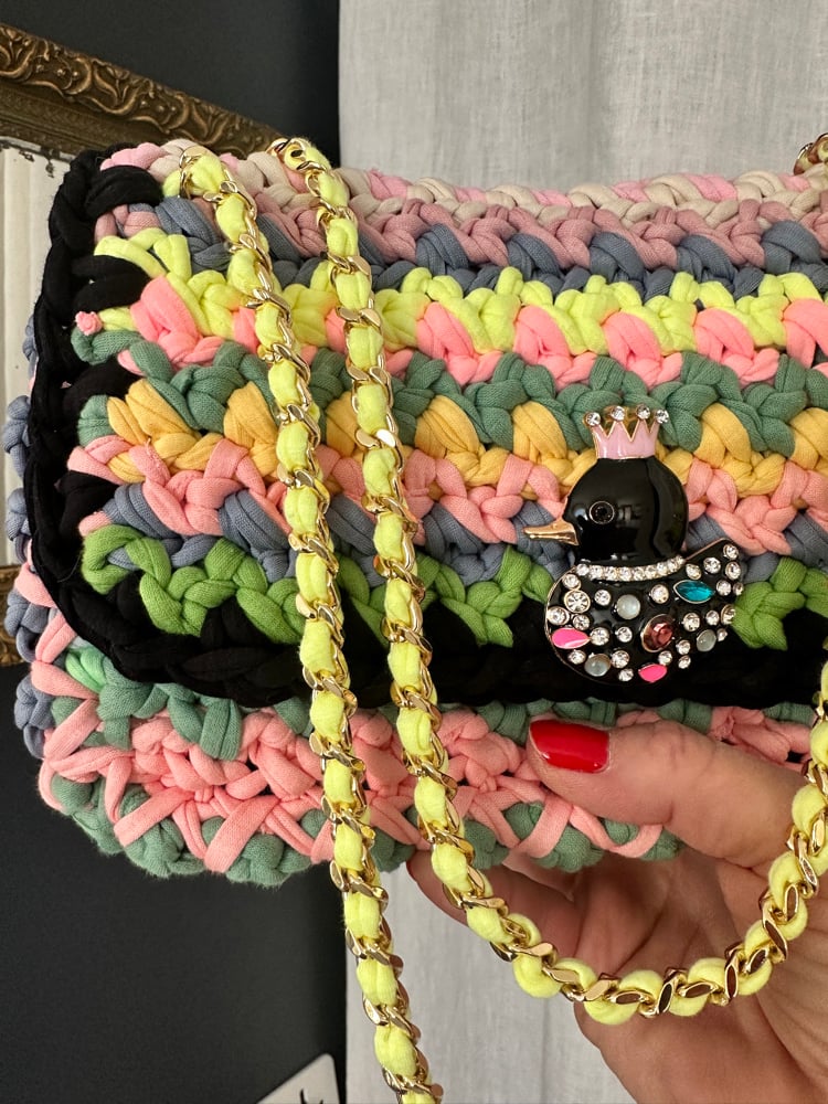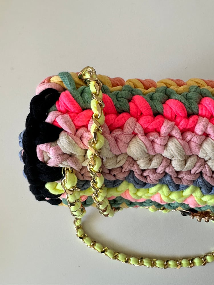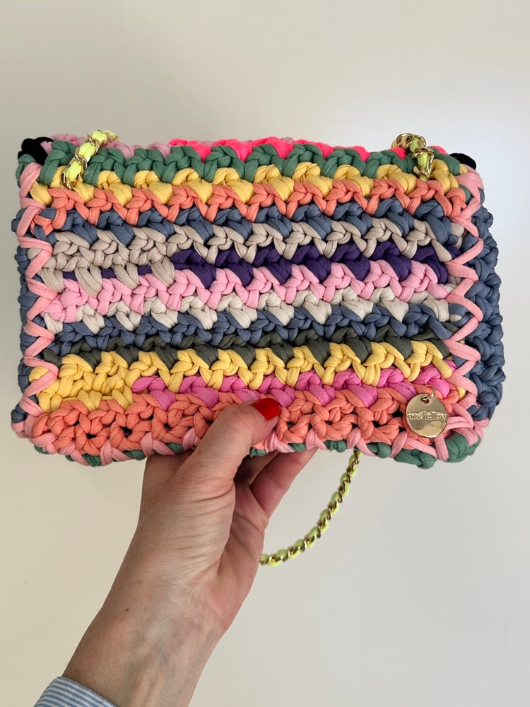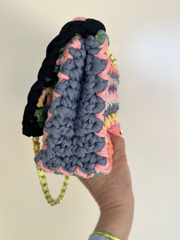 Modèle réalisé au crochet avec des fils de jersey dans des coloris pastels aléatoires .