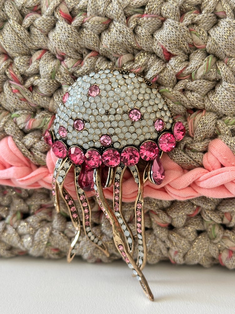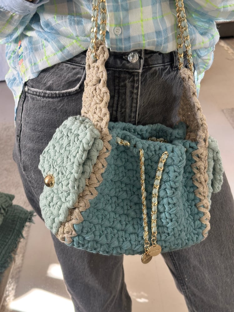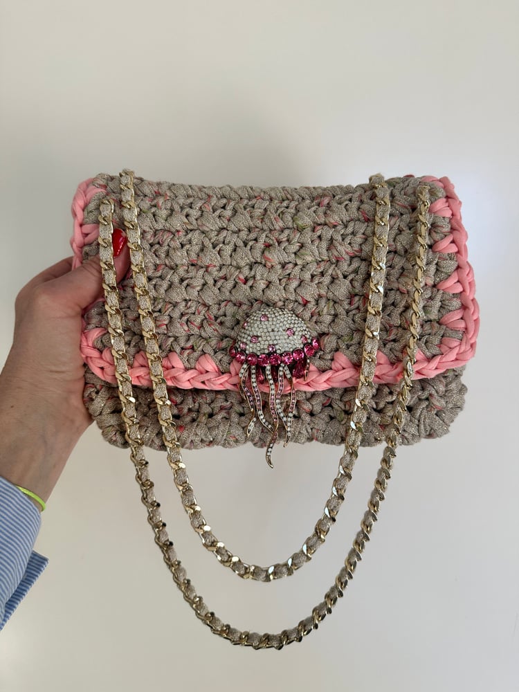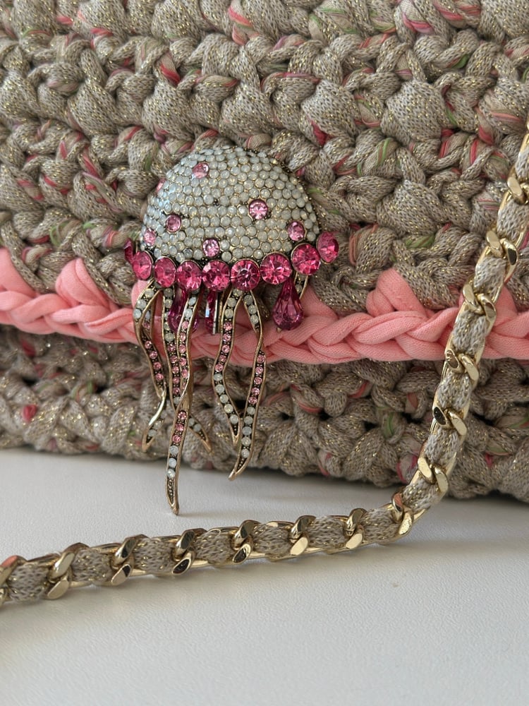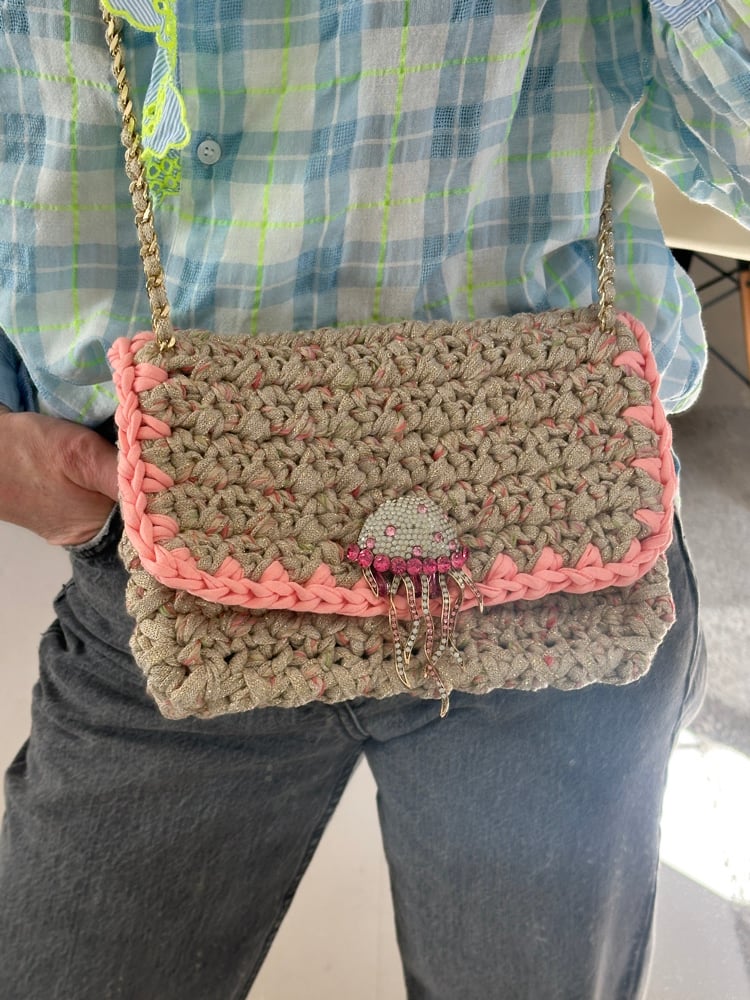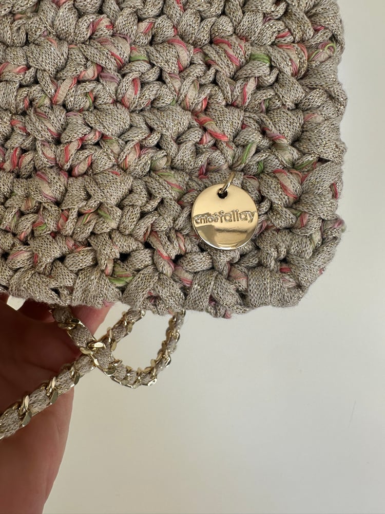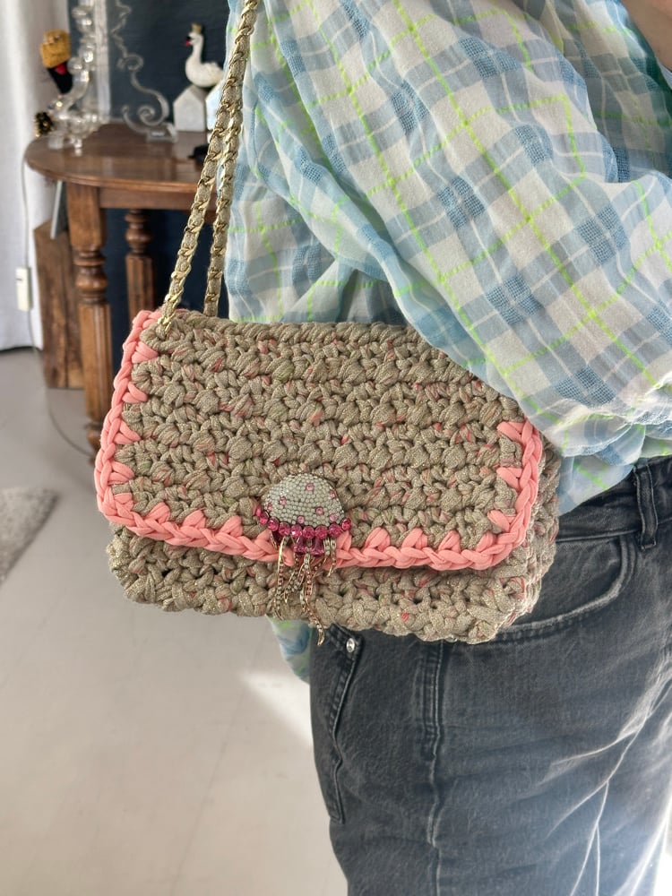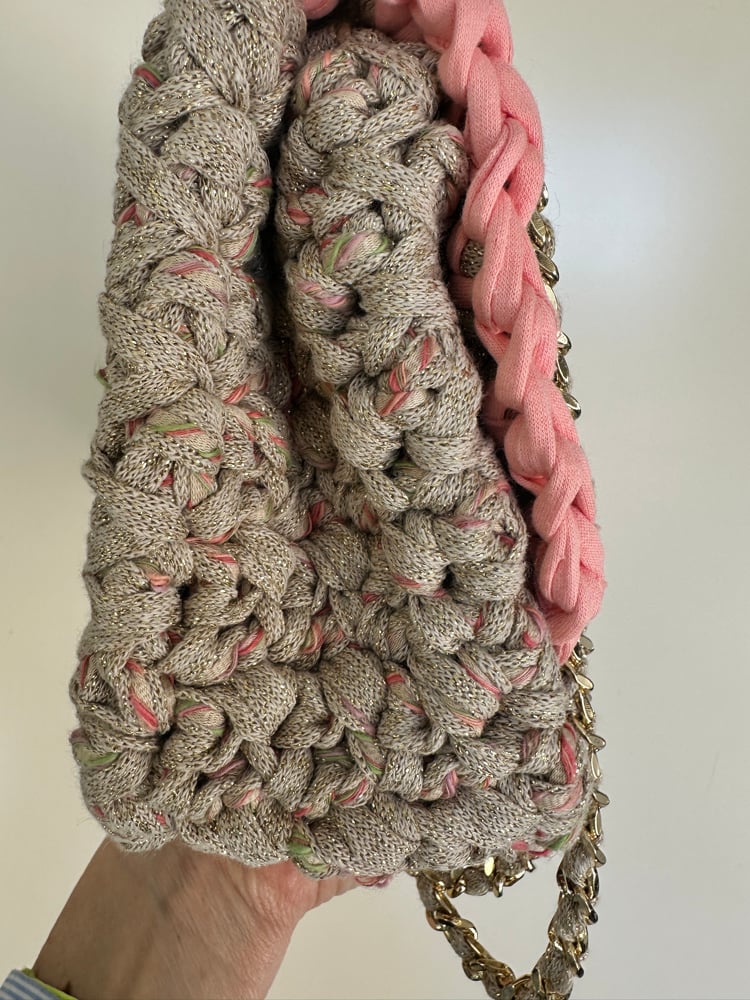 Fil beige doré lurex + fil de coton beige + fils pastels rose et vert . Contour jersey rose clair.